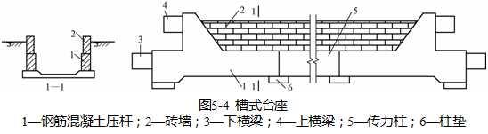 槽式台座由端柱、传力柱、柱垫、横梁和台面等组成,既可承受张拉力,又可作蒸汽养护槽,适用于张拉力较大的大型构件,如吊车梁、屋架等,如图5-4所示。