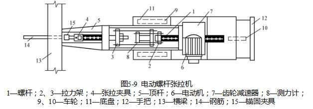 电动螺杆张拉机既可以张拉预应力钢筋也可以张拉预应力钢丝。它是由张拉螺杆、电动机、变速箱、测力装置,拉力架、承力架和张拉夹具等组成。最大张拉力为300~600 kN,张拉行程为800 mm,张拉速度2 m/min,自重400 Kg。为了便于工作和转移,将其装置在带轮的小车上,电动螺杆张拉机的示意图如图5-9所示。