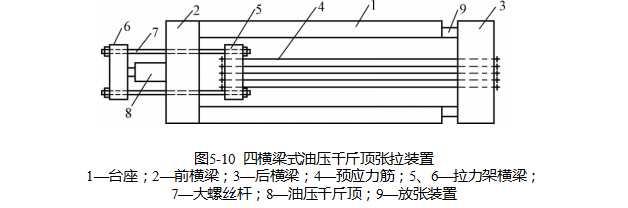 油压千斤顶可张拉单根预应力筋或多根成组预应力筋。多根成组张拉时,可采用四横梁装置进行,见图5-10。