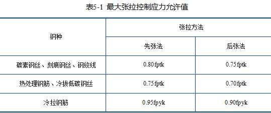 预应力筋张拉应根据设计要求进行。预应力筋的张拉有单根张拉和多根成组张拉,单根张拉所用设备构造简单,易于保证应力均匀,但生产效率低,而且对预应力筋过密或间距不够大时,张拉和锚固较困难。张拉控制应力:张拉时的控制应力应按设计规定。最大张拉控制应力不得超过表5-1的规定。
