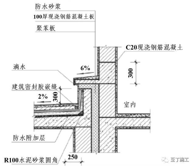 4、出屋面反坎防渗漏做法在侧墙凝土