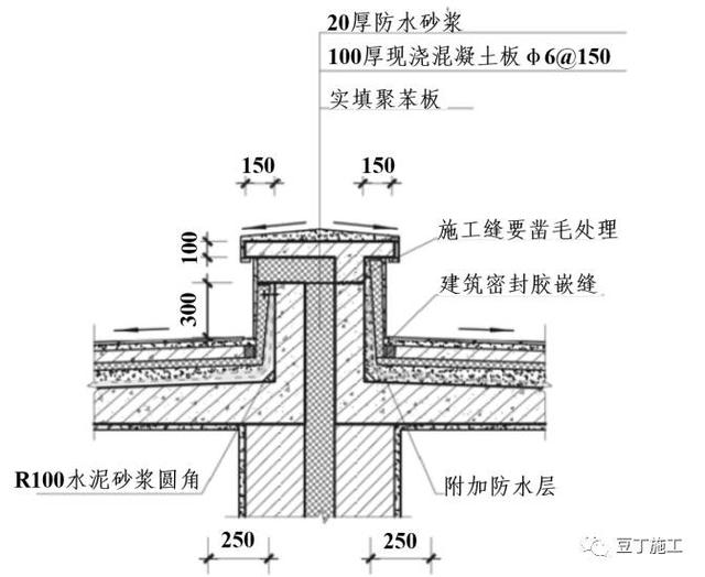 管周防水附加层:找平层级圆角施工完后,在套管周边250mm内涂刷防水层,并且沿套管根部上翻250mm以上(倒置式屋面应考虑保温层厚度);