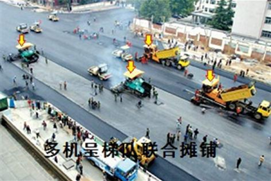 2.城市快速路、主干路宜采用两台以上摊铺机联合摊铺,其表面层宜采用多机全幅摊铺,以减少施工接缝,每台摊铺机的铺筑宽度不宜超过6m(水泥面层摊铺宽度不宜小于3.5m),通常采用2台或多台摊铺机前后错开10~20m呈梯队方式同步摊铺,两幅之间应有30~60mm左右宽度的搭接,并应避开车道轮迹带,上下层搭接位置宜错开200mm以上。