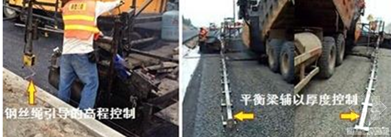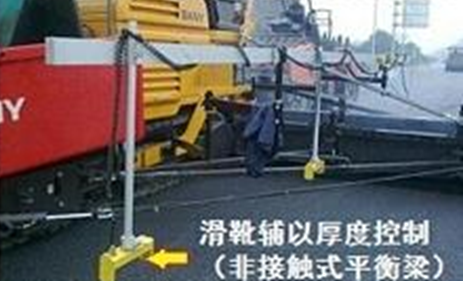 5.摊铺机应采用自动找平方式。下面层宜采用钢丝绳引导的高程控制方式。上面层宜采用平衡梁或滑靴并辅以厚度控制方式摊铺。