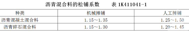 7.沥青混合料的松铺系数应根据试铺试压确定。应随时检查铺筑层厚度、路拱及横坡,并辅以使用的沥青混合料总量与面积校验平均厚度。松铺系数的取值可参考表1K411041-1中所给的范围。