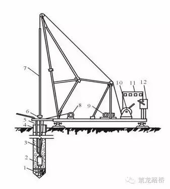 1-钻头;2-潜水钻机;3-电缆;4-护筒;5-水管;6-滚轮(支点);7-钻杆;8-电缆盘;9-5KN卷扬机;10-10KN卷扬机;11-电流电压表;12-启动开关