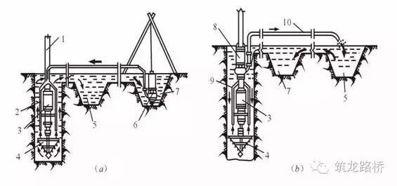 1-钻杆;2-送水管;3-主机;4-钻头;5-沉淀池;6-潜水泥浆泵;7-泥浆泵;8-砂石泵;9-抽渣管;10-排渣胶管