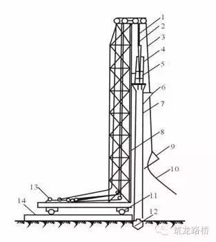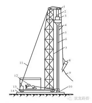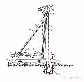 1-副滑轮;2-主滑轮;3-主杆;4-前拉索;5-后拉索;6-斜撑;7-双滚筒卷扬机;8-导向轮;9-垫木;10-钢管;11-供浆管;12-溢流口;13-泥浆渡槽;14-护筒回填土;15-钻头
