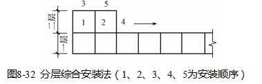 分层综合安装法(图8-32),就是将多层房屋划分为若干施工层,起重机在每一施工层中只开行一次,首先安装一个节间的全部构件,再依次安装第二节间、第三节间等。待一层构件全部安装完毕并最后固定后,再依次按节间安装上一层构件。