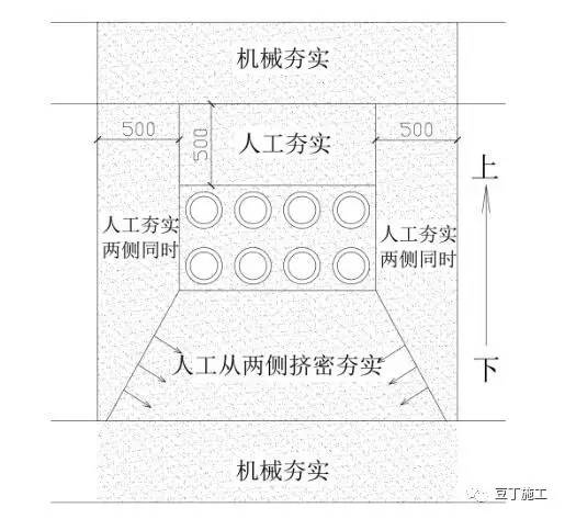 工艺说明:管道下方受管道限制,已无法使用机械夯实时,采用人工从管道下方挤密夯实;管道两侧及正上方500㎜范围内用人工夯实,避免损坏管道。管道以上500㎜外,正常使用机械夯实。冬期回填管沟底至管顶0.5m范围内不得使用含有冻土的回填土。