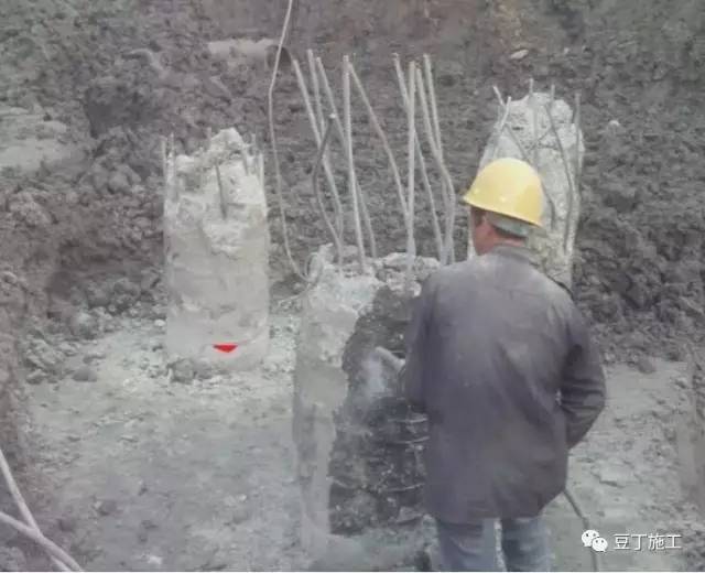 工艺说明:由于预拌砼粗骨料偏小,水灰比过大,振捣砼水泥浆时桩顶浮浆过厚,影响桩的抗压强度。桩浇筑砼应高于设计标高30~50㎜,砼初凝前剔除部分桩顶浮浆,砼终凝后采用人工凿打见石子为宜。