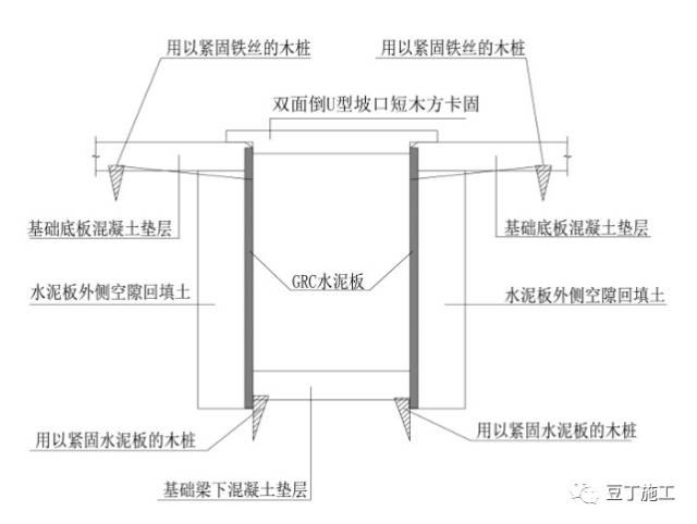 工艺说明:在水泥板安装位置线内侧用木楔固定。木楔露出土面高度必须小于垫层厚度。在垫层浇筑前用12#铁丝将水泥板顶部拉紧加固,一般间隔800mm左右一道铁丝,并与位于基础梁之间地基土上所钉的木桩拉紧。