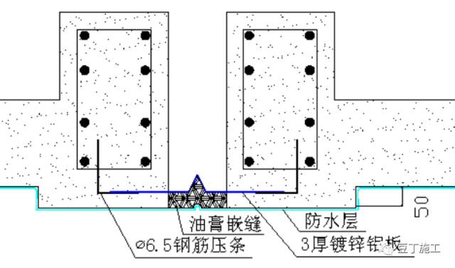 工艺说明:变形缝两侧顶板在同一标高时,采用伸缩式3厚镀锌铝板,为便于安装固定铝板,可将两侧梁上部局部加厚5cm