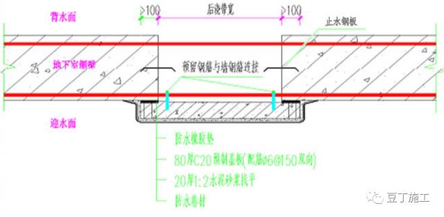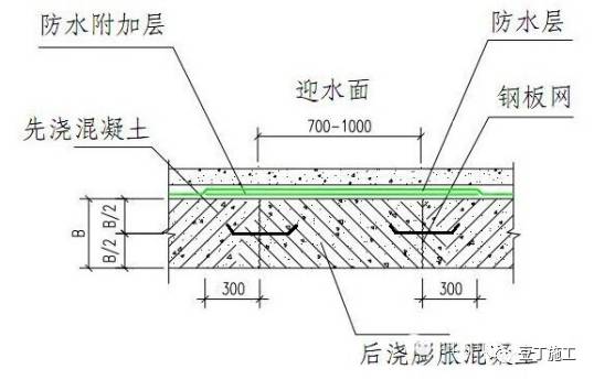 工艺说明:推广使用下沉式超前防水后浇带,在后浇带下做同后浇带宽100厚沉渣槽,并向集水坑作.5%-1%找坡,防止凿毛的砼渣侵入后浇筑的砼中,后浇带封闭前必须进行老混凝土面全部剔凿,露出石子。原预留钢筋割除或松散的须恢复,搭接采用焊接,后浇带处铺一层3厚防水卷材作为附加层,两侧各伸过后浇带300mm。