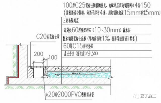 层最薄60厚碎石滤水层,并通过在外墙四周设排水沟进行有组织排水,地下室车库入口处及坡道结束处应设置截水沟,坡道结束处应设置水位自动报警,并与排水泵实现联动。
