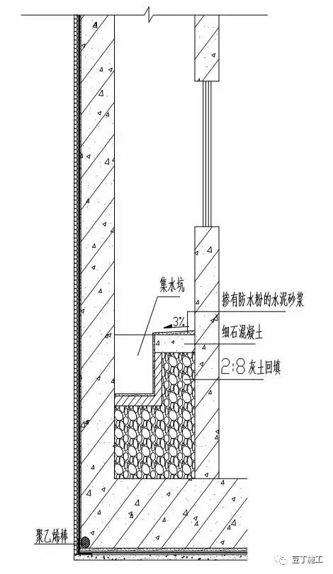 工艺说明:采光井内先用2:8灰土回填夯实,再浇筑细石混凝土层;集水坑用灰砂砖砌筑;集水坑及细石混凝土层表面均抹掺有防水粉的水泥砂浆,向集水坑找坡。