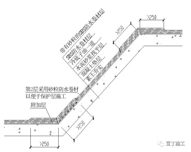 电梯井、积水坑基层阴阳角必须做成 50mm的圆弧或45(135)八字角,阴阳角、立面内角、外角及施工缝处均做500mm宽的附加层。电梯井、积水坑斜面的第二层防水卷材采用带有砂粒的,以便于防水保护层的施工。
