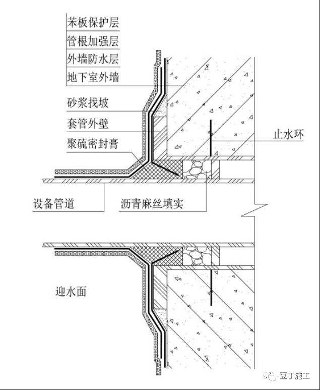 工艺说明:在进行大面积防水卷材铺贴前,应先穿好带有止水环的设备管道(止水环外径比套管内径小4mm),并固定好,设备管道与套管之间的缝隙先填塞沥青麻丝,再填塞聚硫密封膏 ,将防水卷材收口嵌入设备管道与套管之间的缝隙,再用聚硫密封膏灌实,最后做一层矩形加强层防水卷材。穿墙管与内墙角凹凸部位的距离应大于250mm,相邻穿线管的间距应大于300mm。