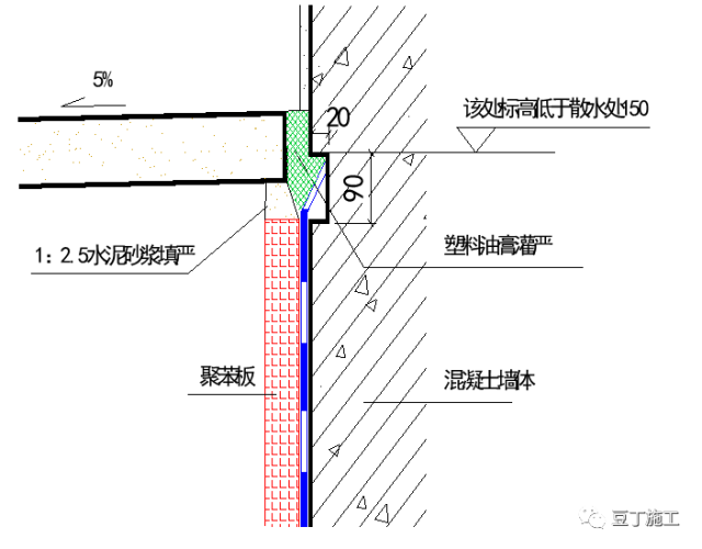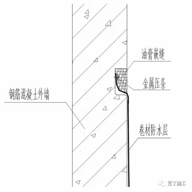 工艺说明:防水收口位置设置在距室外散水上150mm处,浇筑墙体混凝土时应预留凹槽,防水末端先用3㎜25㎜,金属压条钢钉固定(间距500㎜再用密封膏封闭。