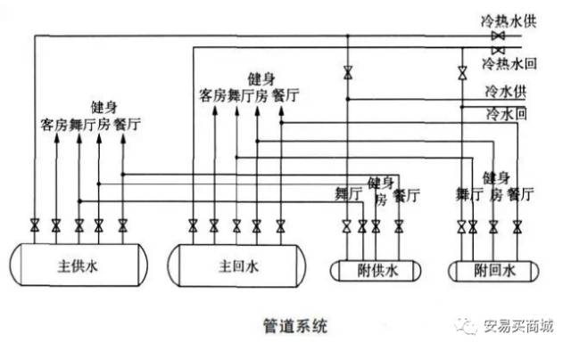 在江苏省地区,考虑到系统的复杂性和建设费用,一般采用二管制,但在春、秋季节气温多变时不能满足高星级饭店的要求,例如:餐厅、舞厅、KTV、健身房等需要供冷,客房、会议室等需要供暖。为了解决此问题,建议采用如下图所示的管道系统: