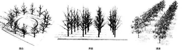 树干以暗示的方式形成空间分割,其空间封闭程度随树干的大小疏密及种植形式不同而不同,树干越多,围合感越强。如:自然界的森林、有行道树的道路、植篱和林地。