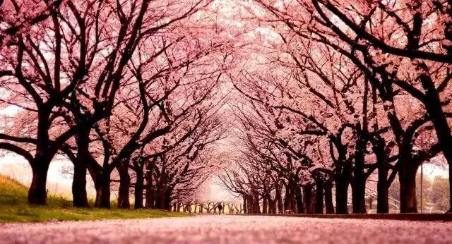 2.雪松深绿色的背景为盛开的樱花提供了极佳的背景,折线状自然种植的单排樱花恰似一片浮云,蔚为壮观。