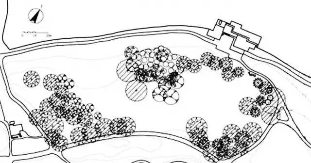 5.在平面图上还可以发现,8株樱花的疏密变化与12株雪松的组合颇为类似,中间紧,两头松,模拟自然界从密林至林缘的生长模式产生自然的景观效果,并以类似的组合方式使两种植物具有内在的联系,和谐统一。
