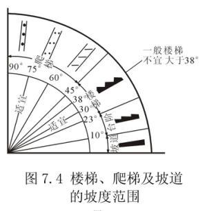 一般楼梯的坡度在23~45之间,常用30左右,舒适角度26-34。坡度超过45时,应设爬梯;坡度小于23时,应设坡道。