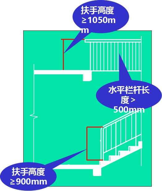 一般建筑物楼梯扶手高度为900mm;平台上水平扶手长度超过500mm时,其高度不应小于1050mm;