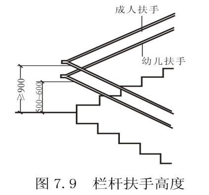 幼托园建筑的扶手高度不能降低,可增加一道600~700mm高的儿童扶手。