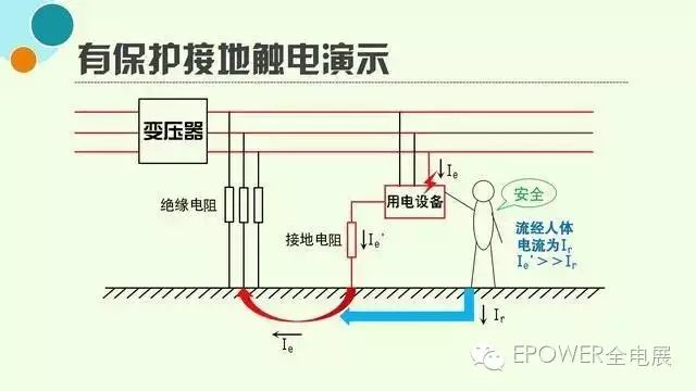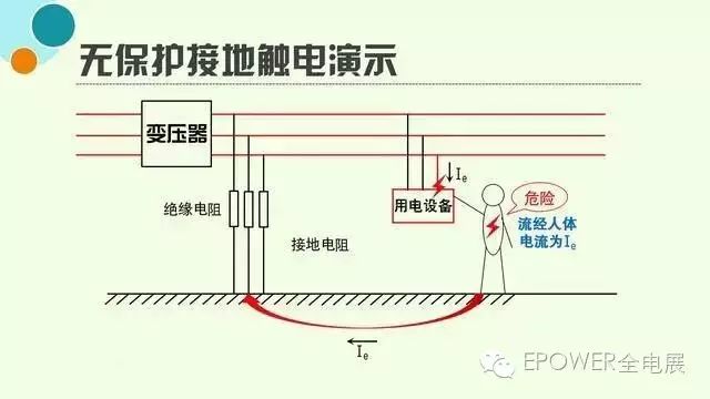 3、保护原理及危害分析(1)在中性点不接地系统中:当人体触及电气设备的导体部分或者外壳时,人体相当于一个与接地电阻并联支路的一个大电阻。若按人体电阻值1000(通常人体电阻值为1000~2000)计算,设备外壳所带电压为220V时,那么无保护接地时流经人体的电流为:Ir=220/Rr=220mA(人体可以承受的最大交流电流/交流摆脱电流为10mA)。