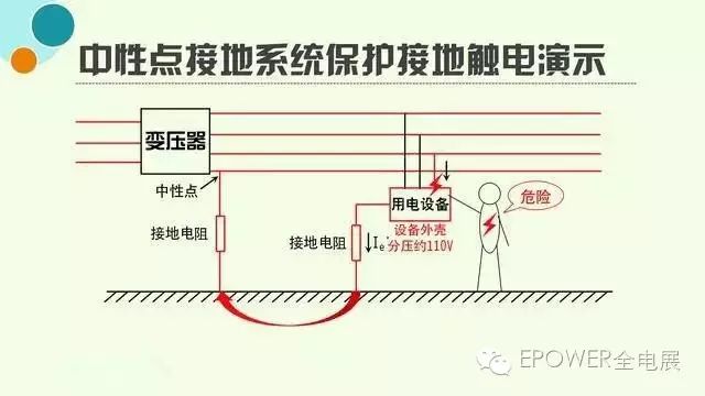 (2)在中性点不接地的三相四线制配电系统中,不允许用保护接零,只能用保护接地。系统中任意一相发生接地,整个系统仍照常运行,但大地与接地线等电位,则接在零线上的用电设备外壳对地电压降等于接地的相线从接地点到中性点的电压值,是十分危险的。