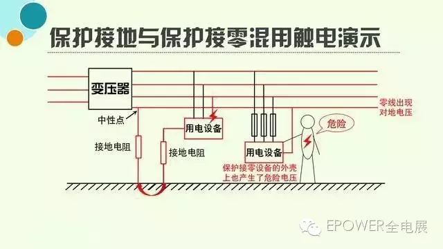 很显然这是非常危险的。如果保护接地电阻阻值大于电源中性点接地电阻,设备外壳所带电压还要更高,危害将更大。严禁部分设备采用保护接地来代替保护接零,造成保护接地和保护接零混接错接。当某一保护接地设备的绝缘损坏,发生相线碰壳时,零线出现对地电压,于是使保护接零设备的外壳上就产生了危险电压。因此,在同一母线供电的线路中,保护接地和保护接零不能混用,即不可把一部分电气设备接零,而将另一部分电气设备接地。一般市电都采用接零保护,故使用市电的电气设备,应采取接零保护。
