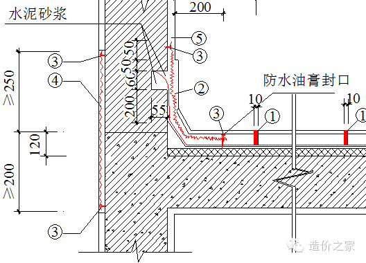 (1)①高弹性防水油膏嵌缝1020;②泛水收口处设金属网;③固定金属网螺丝(或铁钉)@500;④砌体女儿墙与砼交接处设金属网(本商住项目工程为钢筋砼女儿墙);⑤女儿墙内侧及压顶每隔3m设10mm分隔缝,嵌填密封材料;