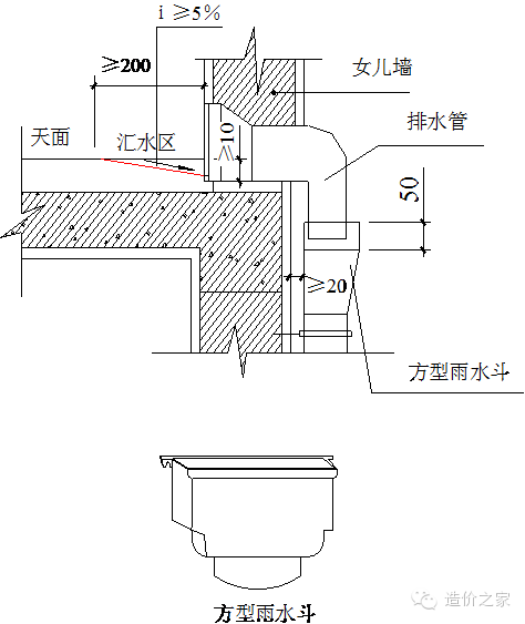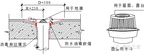 屋面、露台地漏汇水区直径宜500mm,坡度宜5%,如图3.1和图3.2所示: