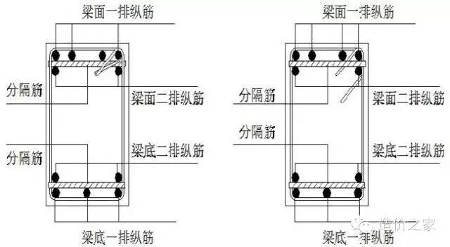 (1)一、二排纵筋之间的净距不小于25mm和一排纵筋直径的较大者。如箍筋弯勾阻挡二排纵筋位置,应按如图9.1a、 9.1b或图9.2b处理。