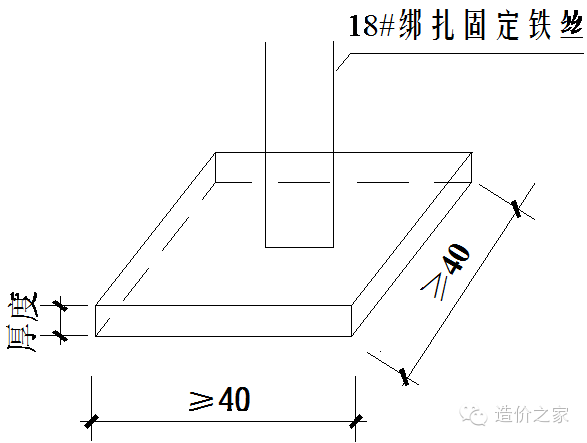 (1)垫卡及垫块:禁止使用碎石做梁、板、基础等钢筋保护层的垫块。梁、板、柱、墙、基础的钢筋保护层采用砂浆垫块时,强度应不低于M15,面积不小于40mm40mm。梁柱垫块应垫于主筋处,厚度为纵筋保护层厚度减去箍筋直径;基础垫块厚度同基础保护层。垫块上应按图9.3.1预留18#绑扎固定铁丝。