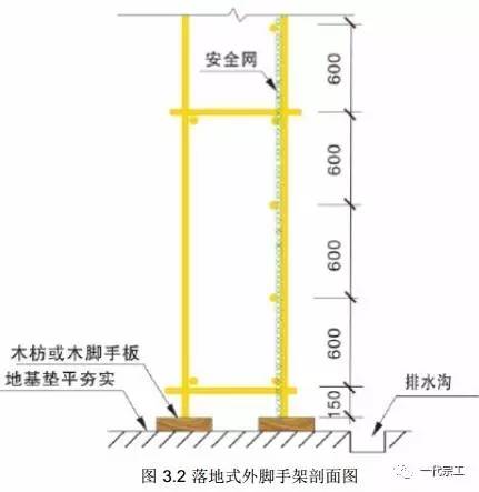 落地式外脚手架基础必须垫平夯实,在基础上沿外脚手架长度方向应设置垫板,垫板材质可采用木脚手板或槽钢等;脚手架基础应釆取有组织排水,四周设置排水沟。