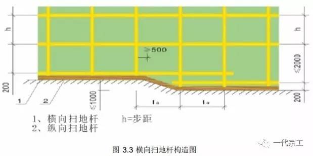 2)脚手架立杆基础不在同一高度时,必须将高处的纵向扫地杆向低处延长两跨与立杆固定, 高低差不大于 1m,靠边坡上方的立杆轴线到边坡的距离不应小于 500mm。