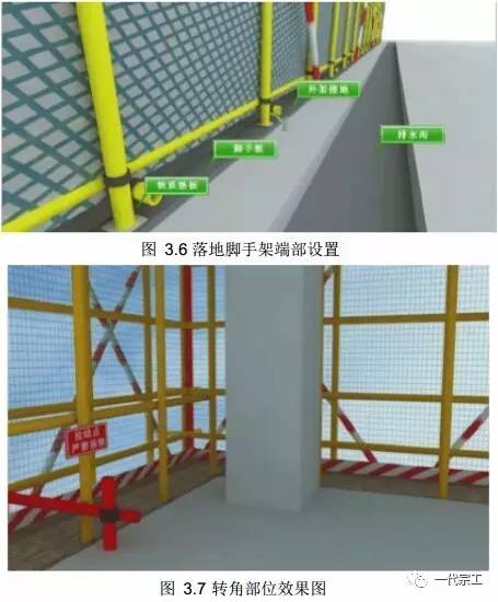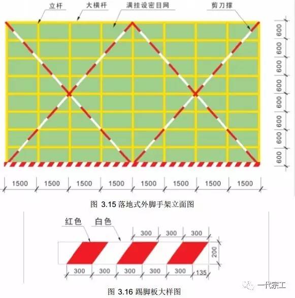 4) 脚手架外排立杆表面刷黄色油漆, 每隔一组或二组剪刀撑设置一道 200mm高踢脚板,固定在立杆外侧,踢脚板表面刷红白警示色油漆。