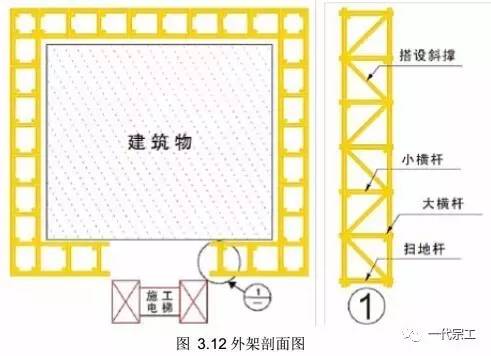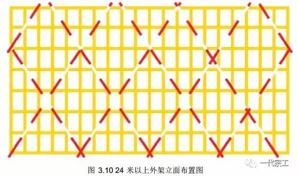 4)横向斜撑为双排脚手架内、外立杆或水平杆斜交呈之字形的斜杆。高度在 24.0m 以下的封闭型双排脚手架可不设横向斜撑,高度在 24.0m 以上的封闭型脚手架, 除拐角应设置横向斜撑外, 中间应每隔 6 跨距设置一道。