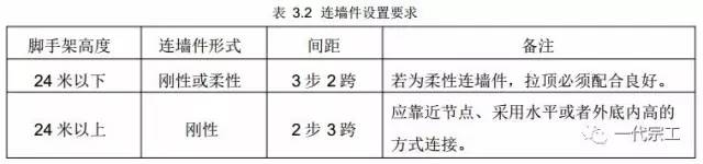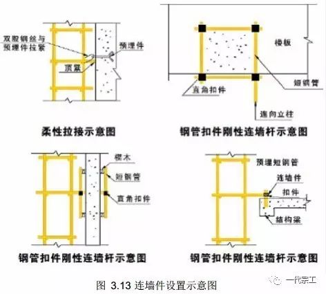 连墙件是保证脚手架稳定的最重要杆件,连墙件应从第一步纵向水平杆处开始设置,在一字型 、开口型两端必须加强设置连墙件。连墙件布置注意事项如下: