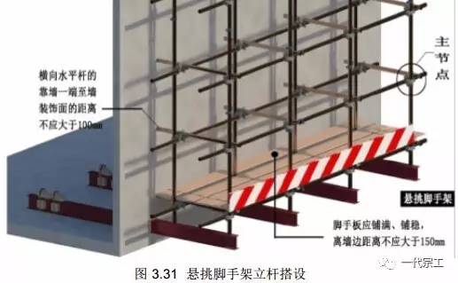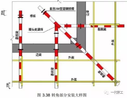 挑梁的布置应保证架体力杆落在其上,并在建筑物角部荷载集中的地方应采取加强措施。(杆件搭设及防护,同前述落地式外架)