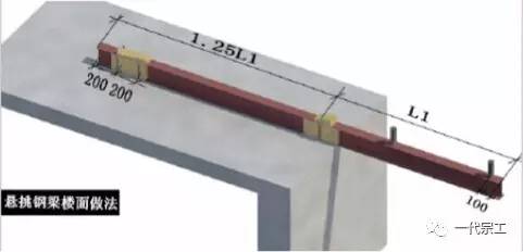 12)悬挑钢梁的支撑点应设置在结构梁上,不得设置在外伸阳台上或悬挑板。