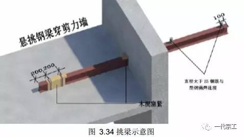7)距悬挑钢梁端部 100mm 处,下面横向焊接长 80mm、直径 25mm 的钢筋作固定钢丝绳用。