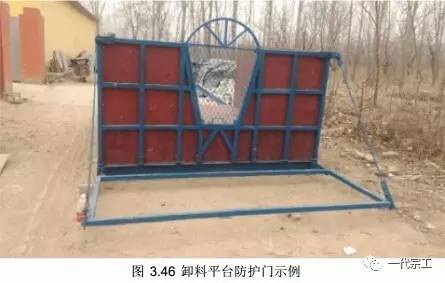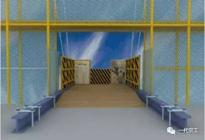 9)悬挑卸料平台前侧,可设置活动防护门。吊运长的钢管、木方时可以打开防护门,放在凹槽内,绑扎钢丝绳时更方便,以此避免将长物料堆放到防护挡板上。