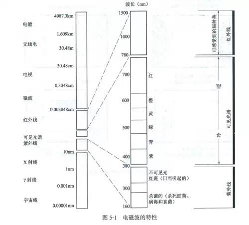 光像人们已知的电磁能一样,是一种能的特殊形式,是具有波状运动的电磁辐射的巨大的连续统一体中的很狭小的一部分。这种射线按其波长是可以度量的,它规定的度量单位是纳米(nm)