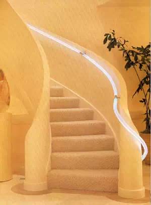 以点光源照亮粗糙墙面,使墙面质感更为加强,通过不同光的特性和室内亮度的不同分布,使室内空间显得比用单一性质的光更有生气。可以利用光的作用,来加强希望注意的地方。