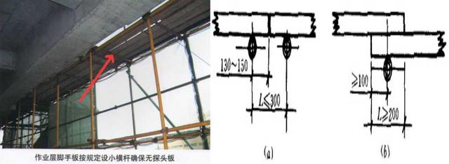 脚手板材质、规格应符合规范要求;脚手板铺设应严密、牢固,探出横向水平杆长度不应大于150mm。