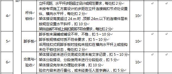 (2)、碗扣式钢管脚手架检查评定保证项目应包括:施工方案、架体基础、架体稳定、杆件锁件、脚手板、交底与验收。一般项目应包括:架体防护、构配件材质、荷载、通道。